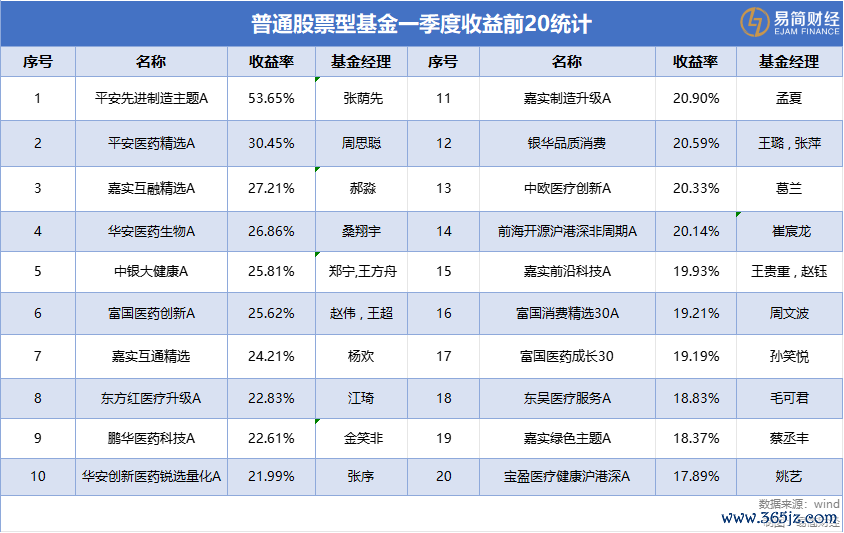 依托医药板块的强势增长,医药主题基金的表现突出。在一季度普通股票型基金排名中,前20名里医药医疗健康类基金占据半壁江山。